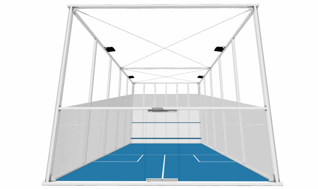 Walls: The walls consist of laminated tempered glass with an integrated interlayer, which significantly attenuates high‑frequency noise and effectively reduces the piercing reverberation typical of standard glass courts while lowering overall play sound emission. The side and front walls feature a white honeycomb print with approximately 50% transparency, while the back wall is fully transparent. A net is installed above the side and front walls and partially at the top to keep the ball inside the court.