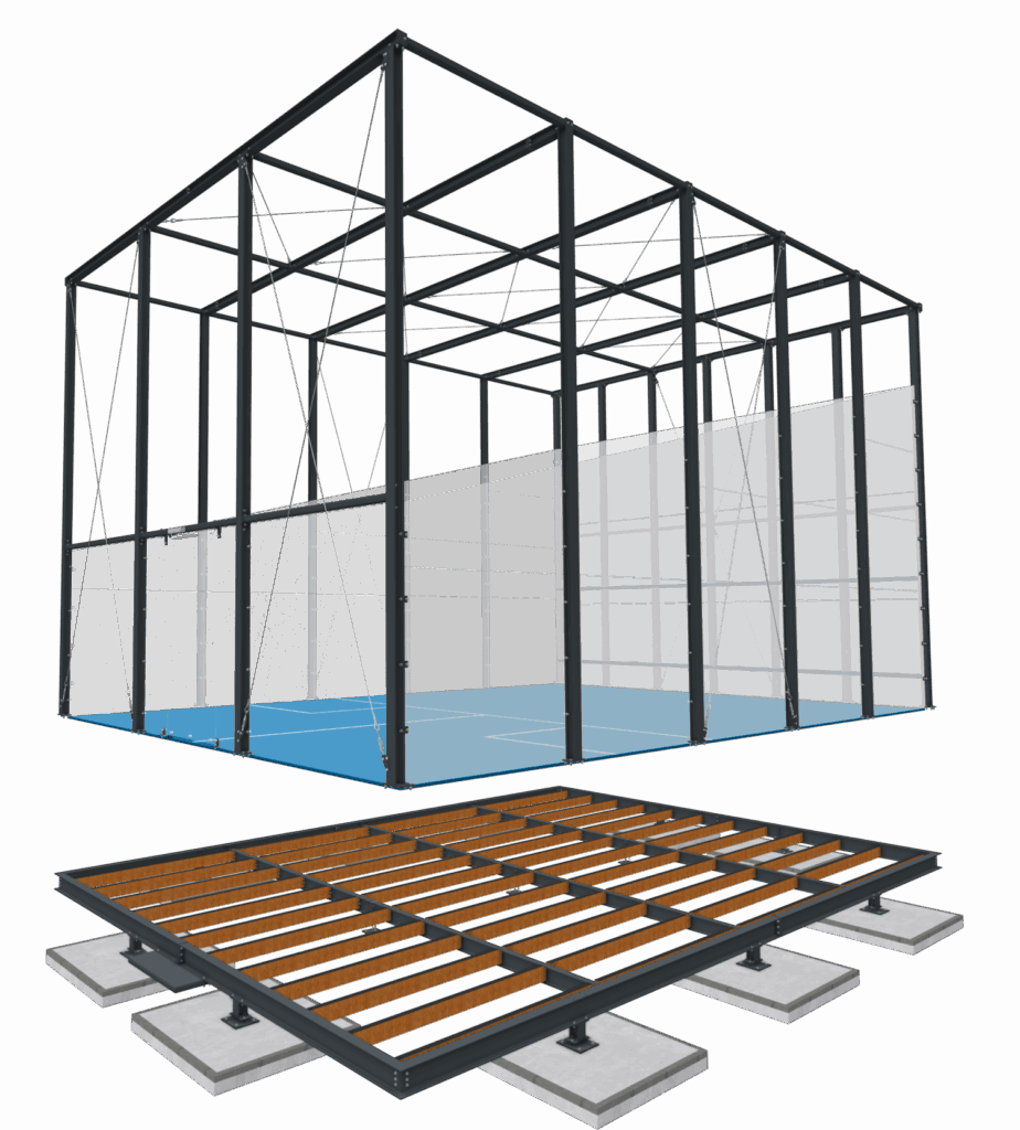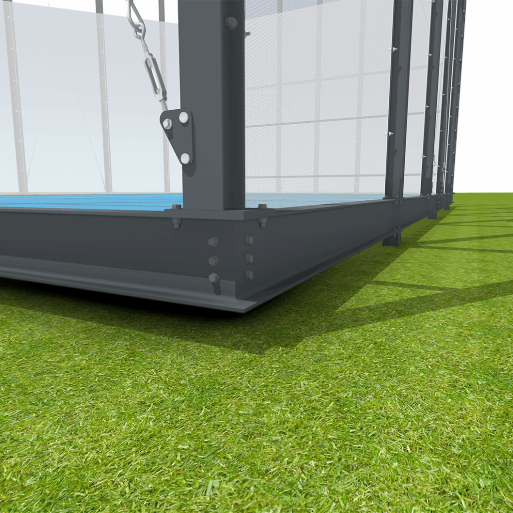 This feature is specifically designed to place the court in any location thanks to a unique steel ringbeam that rests on ten height adjustable feet, allowing the entire structure to be installed on ten prefabricated concrete slabs or pads. This makes the court easy to set up and relocate wherever needed. The elevated, permeable floor ensures rapid drainage of rainwater and natural air flow, keeping the court dry and well ventilated. The flooring features a timber substructure with recycled rubber pads. The combination of composite panels, timber joists and rubber pads ensures a comfortable and soft yet responsive playing surface, perfect for those with sensitive joints and those looking for a high paced match.